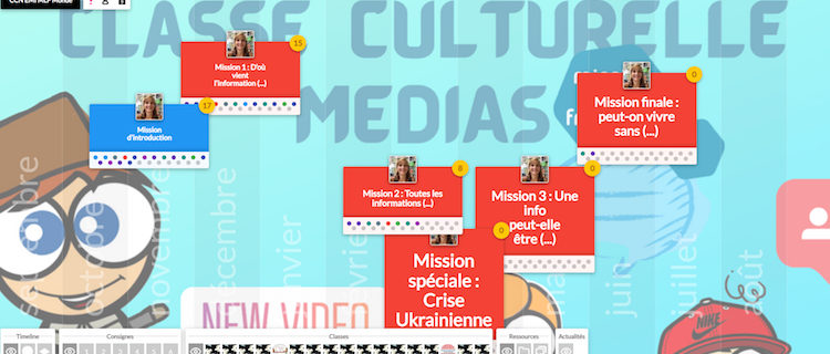 – La mise en place d’espaces d’expérimentation à travers des dispositifs en ligne. Depuis 8 ans, je participe à la conception et à l’animation d’un dispositif autour de l’EMI : une Classe Culturelle Numérique Médias6 hébergée sur une plateforme. Il s’agit d’une formation clé en main à destination des élèves pour travailler l’EMI sous forme de missions. Les classes inscrites à ce dispositif reçoivent ainsi des consignes scénarisées pour des séances. Ce dispositif permet de cadrer l’EMI en concevant une progression annuelle à raison de 2 h minimum par mois et en réalisant des productions à poster sur la plateforme. Les retours des enseignants sont très positifs dans le sens où il se retrouvent en position d’apprenants avec les élèves, car ils découvrent en même temps qu’eux, tout en se sentant légitimes grâce aux supports pédagogiques ainsi qu’à la possibilité de partager, d’échanger et d’avoir un interlocuteur référent susceptible de répondre à leurs interrogations.